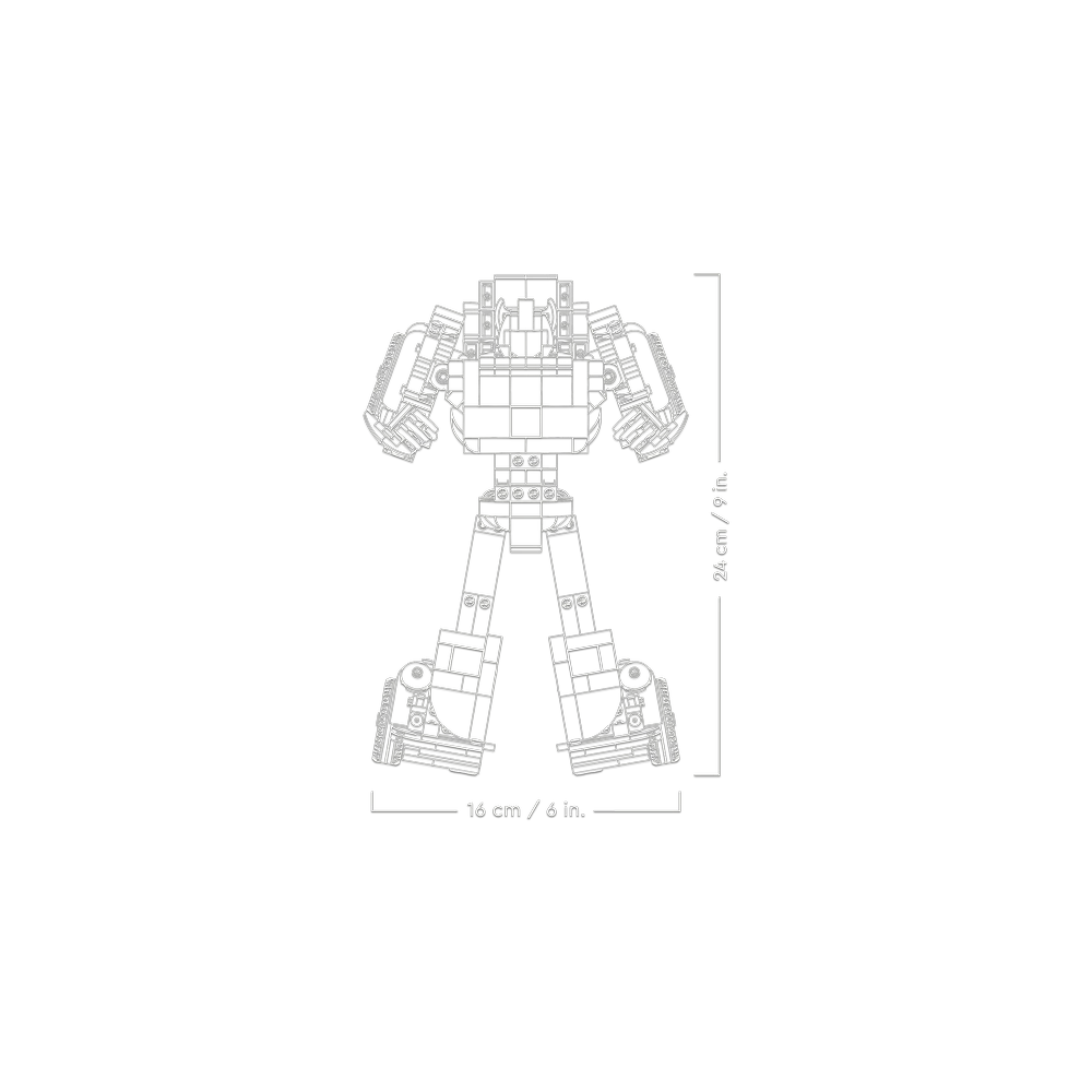 - Dimensiones: El Autobot de este set de 950 piezas mide aproximadamente 25 cm de altura; en el modo vehículo, mide aproximadamente 8 cm de altura, 22 cm de longitud y 11 cm de anchura