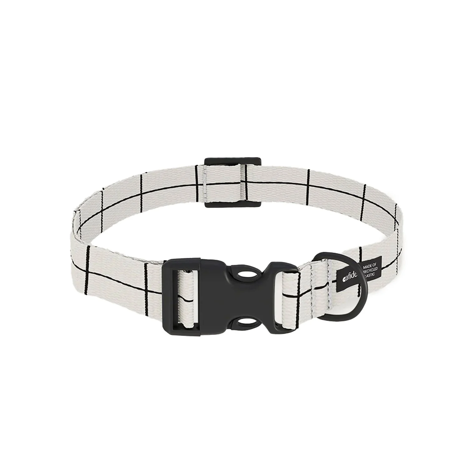 Collar para perro fácil de limpiar, hecho en tejido de botellas recicladas en Europa. Producto ligero y ajustable gracias a sus herrajes en plástico resistente.