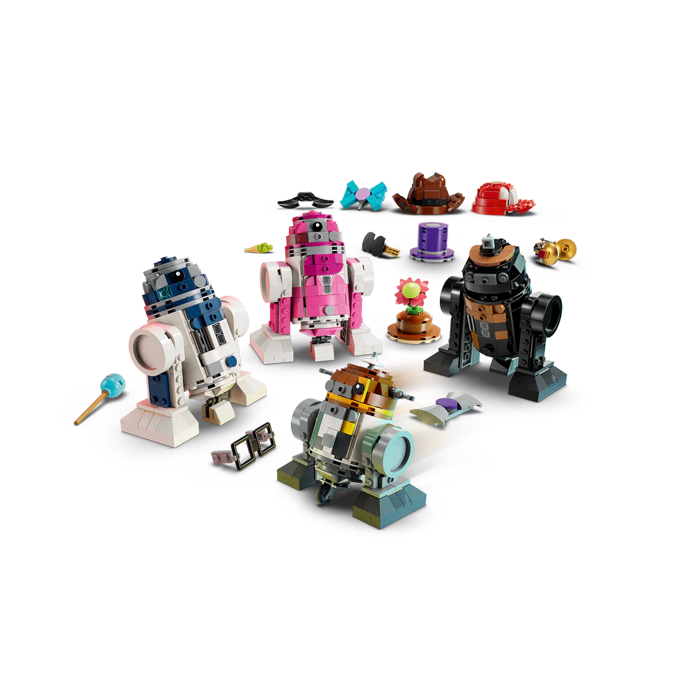 - 4 figuras de juguete LEGO® construibles de droides: R2-D2, Chopper (C1-10P), QT-KT y R5-J2, así como una minifigura de la Joven Princesa Leia con su droide L0-LA59, alias Lola, por el 25 aniversario de LEGO Star Wars™