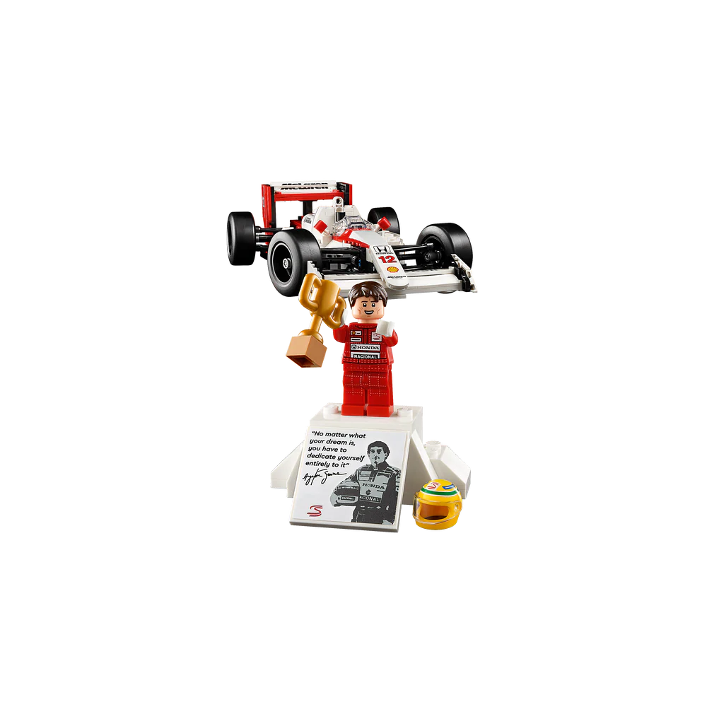 La réplica del McLaren MP4/4 está equipada con mecanismo de dirección, suspensión por tirantes, alerón trasero ajustable, neumáticos lisos, espejos, palanca de cambios y detallado motor V6 turboalimentado, y viene con una base de exposición y una placa con interesantes estadísticas. La minifigura de Ayrton Senna trae una base tipo podio y una placa con una cita y una foto del piloto.