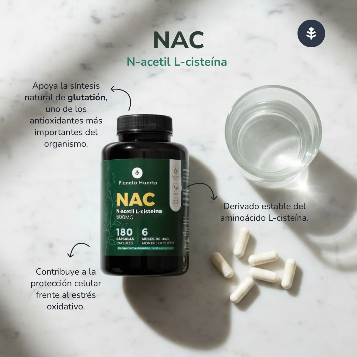 El NAC (N-acetil L-cisteína) de Planeta Huerto es un complemento alimenticio de alta calidad diseñado para apoyar los procesos naturales de detoxificación del organismo y favorecer el equilibrio antioxidante. Cada cápsula aporta 600 mg de NAC, una forma estable y altamente biodisponible de la L-cisteína, precursora esencial del glutatión, uno de los antioxidantes más importantes del cuerpo.