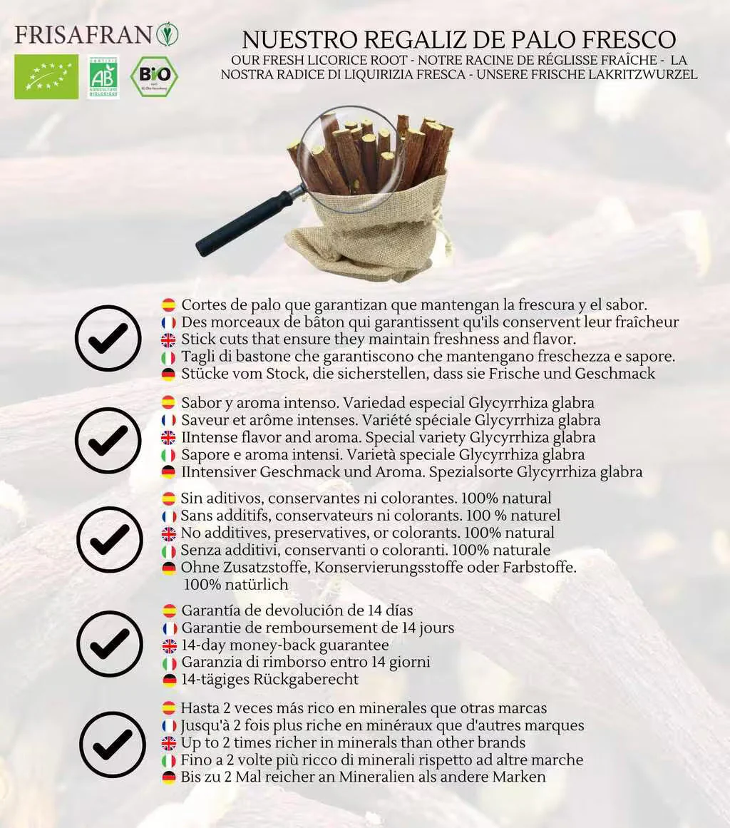 Compra aquí Regaliz de Palo Ecológico Fresco, ¡el de siempre! Disfruta de baras jugosas y frescas de 20 a 22 cm, perfectas para un sabor natural y delicioso.