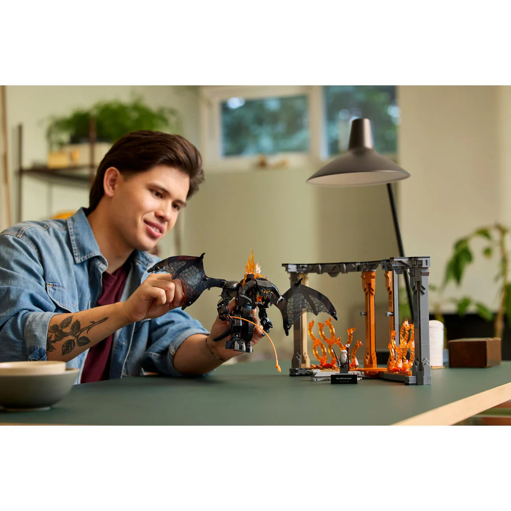 La maqueta, que lleva una placa con las palabras “You Shall Not Pass”, presenta a Gandalf el Gris firme y desafiante, sin miedo, y al Balrog con sus imponentes alas desplegadas ante un muro abrasador de llamas. La minifigura de Gandalf tiene un bastón y una espada, y la figura del Balrog empuña un látigo y posee alas y extremidades articuladas.