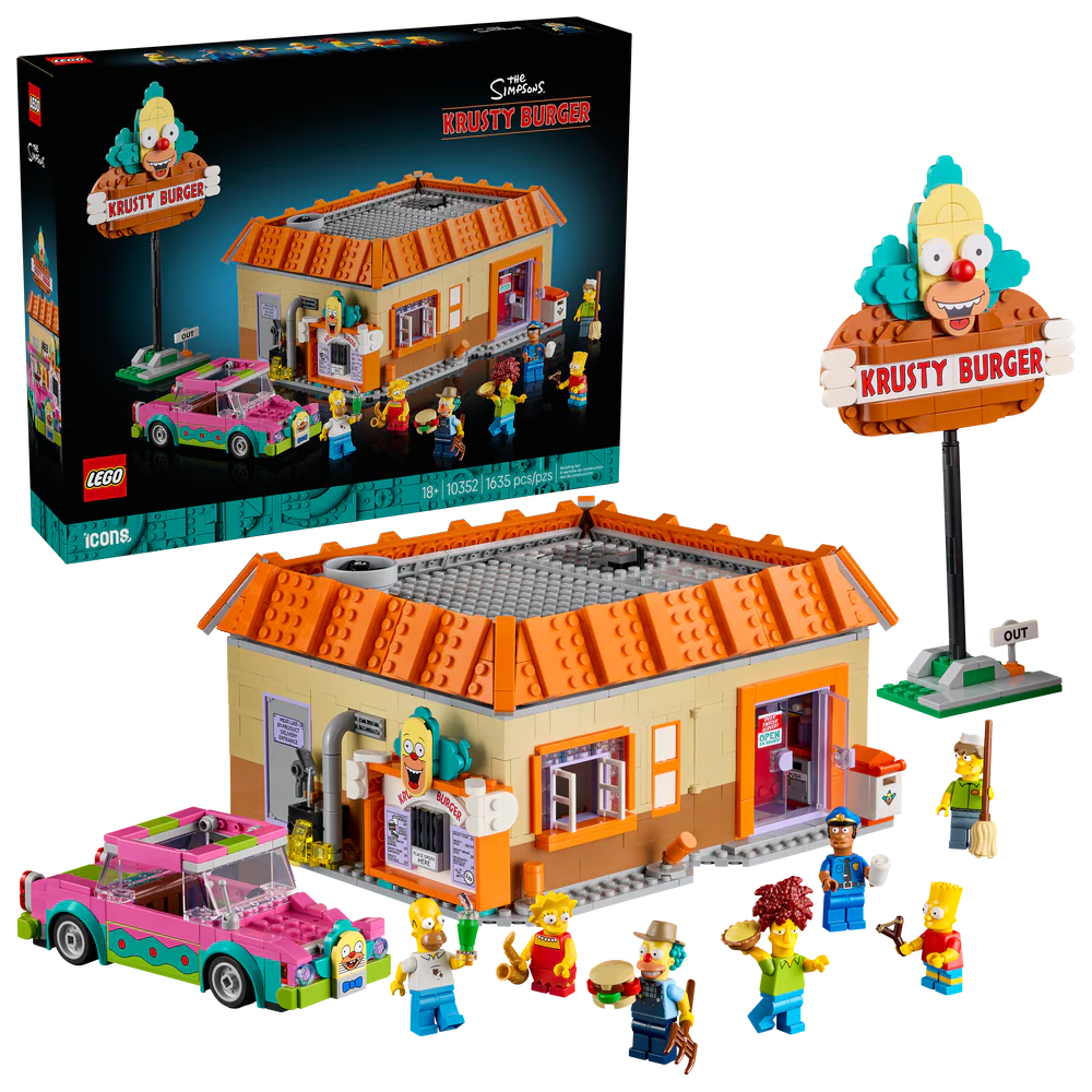 ¡Recrea el legendario restaurante de comida rápida de Springfield con el set para adultos LEGO® Icons The Simpsons™: Krusty Burger (10352)! Construye una detallada maqueta del lugar preferido de Homer para comer, con cocina, comedor, baño y ventanilla del servicio para llevar. Este set de decoración, imprescindible para cualquier fan de The Simpsons, cuenta con un poste anunciador del Krusty Burger y una réplica del coche de payaso de Homer, además de con minifiguras de Homer, Bart y Lisa Simpson, Farmer Krusty, Sideshow Bob, Squeaky Voiced Teen y Officer Lou.