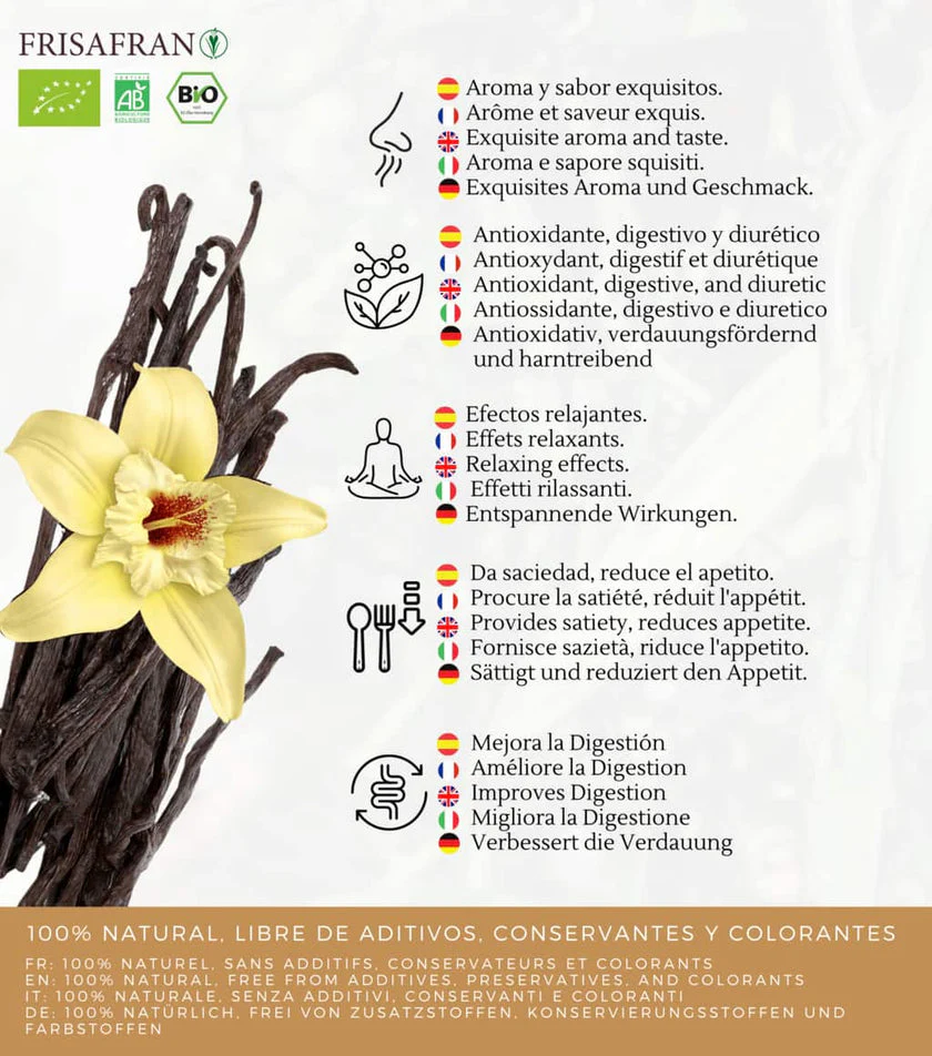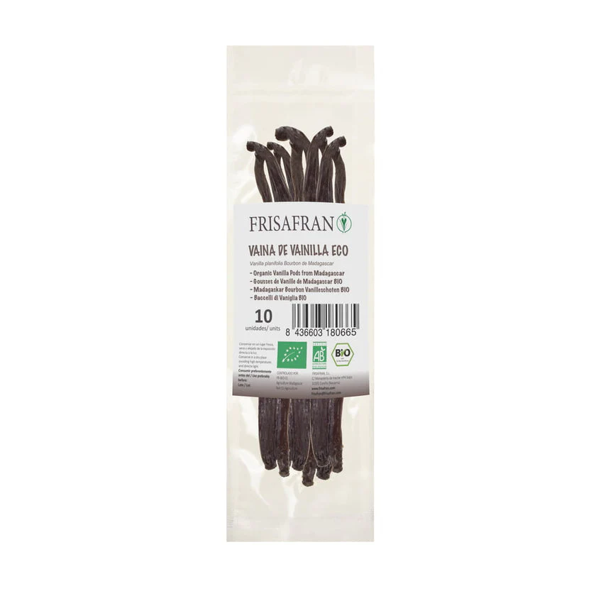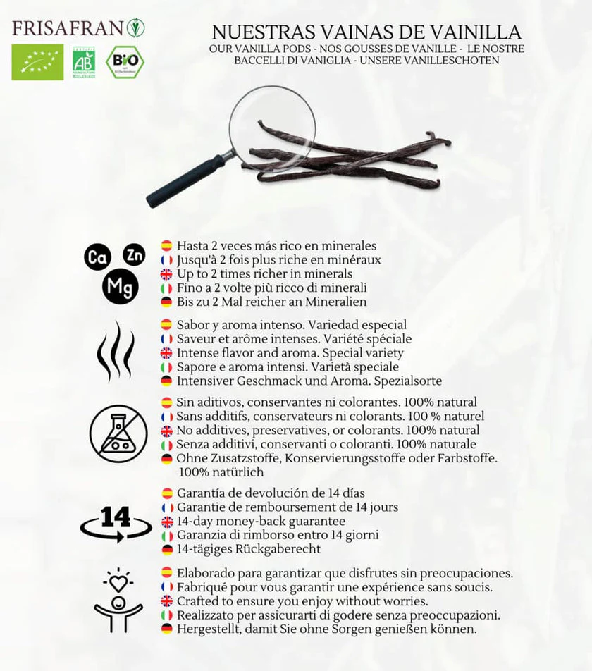🌿 Vainas de vainilla ecológica Bourbon, categoría 1 o 2, sin agrietar, sin haber sido sometidas a ningún tratamiento que pudiera modificar más o menos su contenido de vainillina natural.